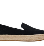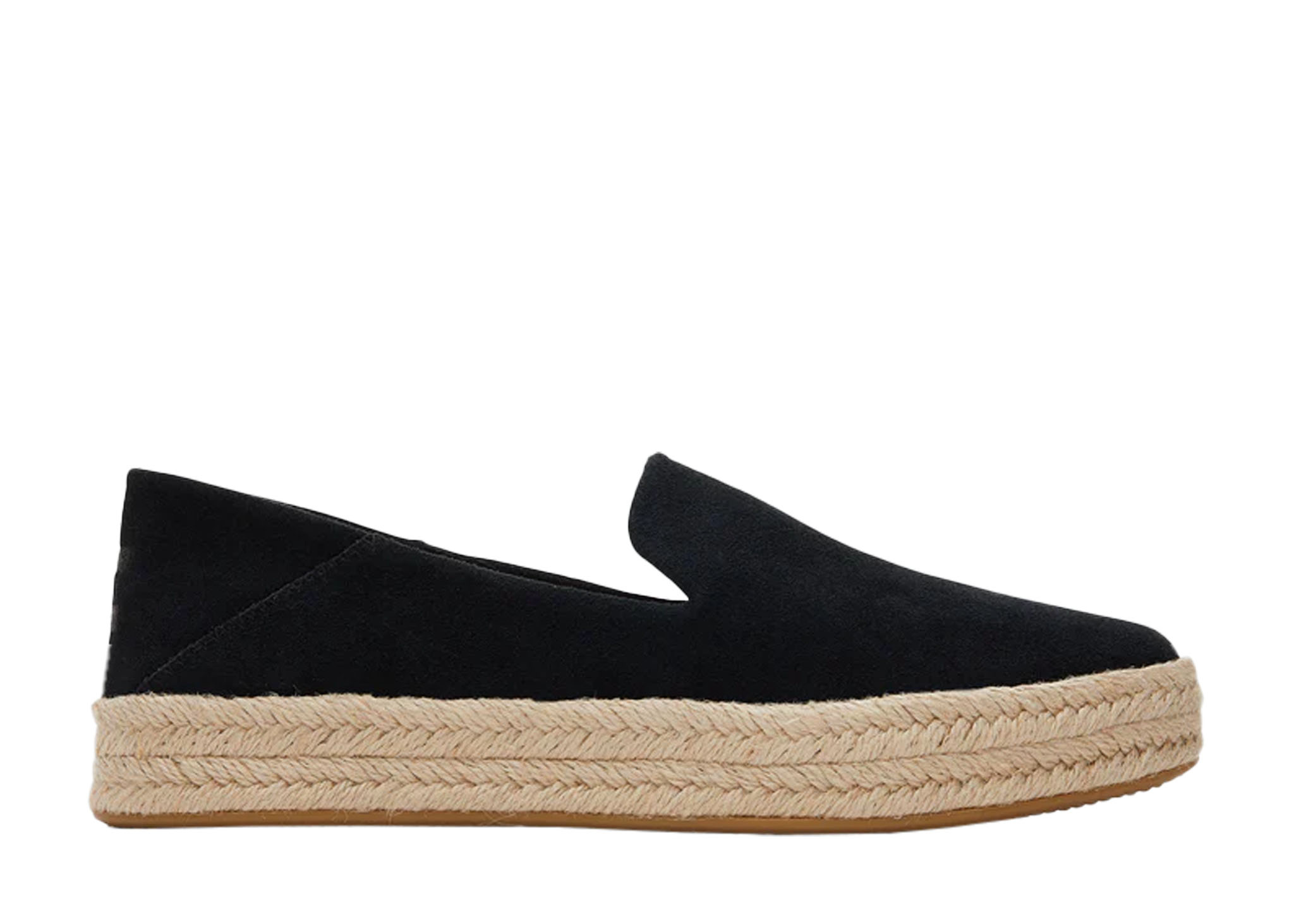 Laat de zomer maar komen! Deze flatform instappers van TOMS; Carolina (10020690) zijn uitgevoerd in zwart suède. De espadrilles kunnen als instappers gedragen worden. Het voetbed van canvas is uitneembaar. De tussenzool is van jute en de loopzool is van rubber met profiel.